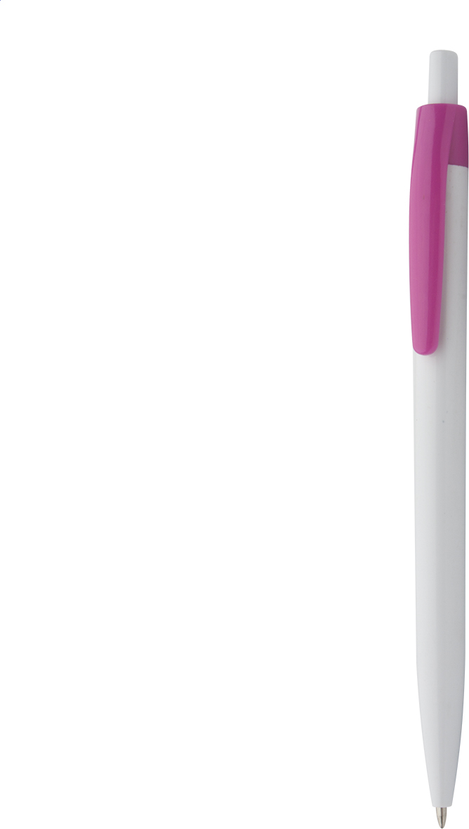 Plastové kuličkové pero s bílým tělem a barevným klipem, s modrou náplní.