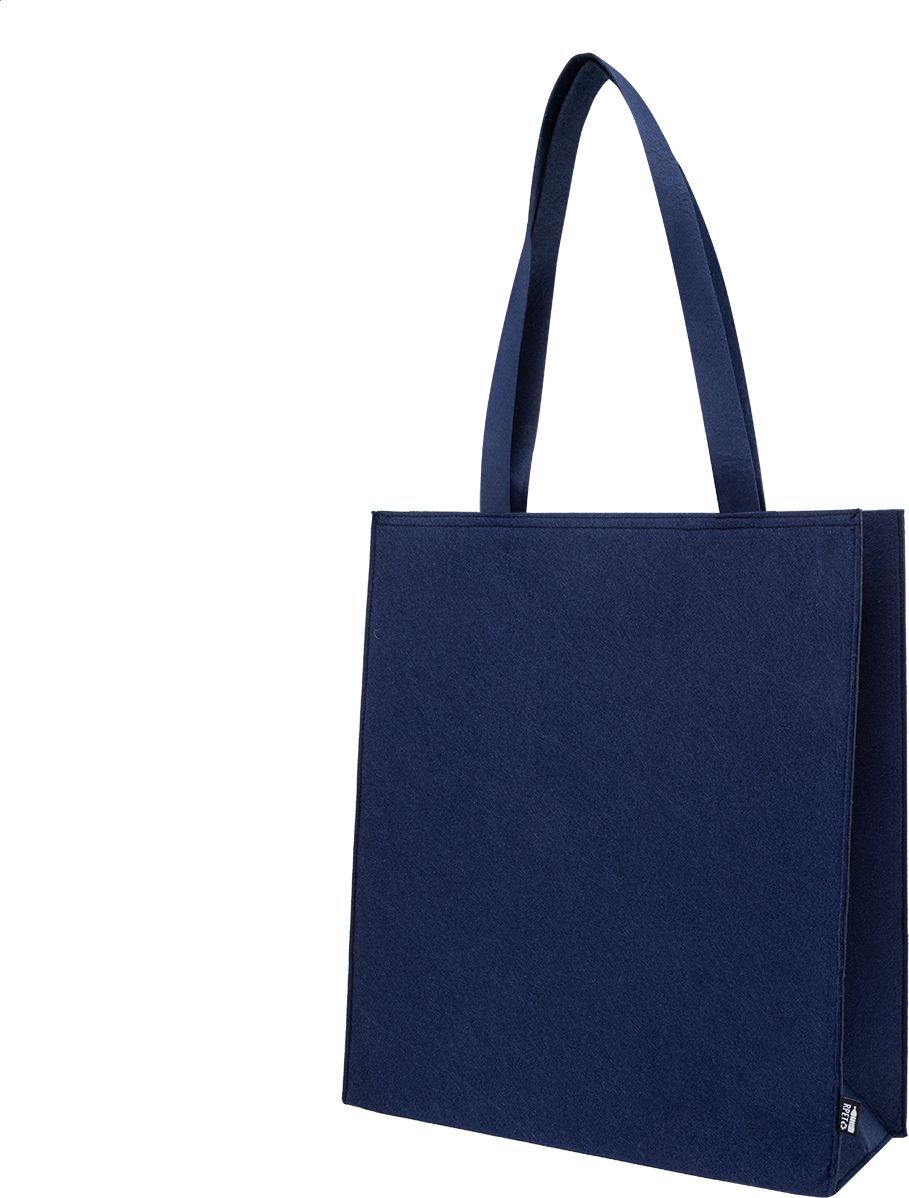 Nákupní taška z RPET plsti s klínkem a dlouhými uchy. S výraznou etiketou z RPET.