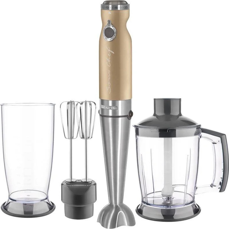 Tyčový mixér je jedním z nejvíce využívaných přístrojů v kuchyni. Pomůže vám s přípravou krémových polévek, omáček, dětské stravy a dalších pokrmů. Mixér Sencor 4 v 1 vám nabízí několik funkcí v jednom výrobku. Kromě mixování rozšiřuje možnosti o sekání i šlehání a ušetří tak místo v kuchyni. Poradí si s každou potravinouTyčový mixér s technologií Titanium QuadBlade je vybaven 4 ostrými čepelemi s titanovým povrchem a v kombinaci se silným motorem si se zpracováním potravin snadno poradí. Na těle tyčového mixéru najdete LED podsvícený hlavní vypínač, tlačítko pro uvolnění nástavců a závěsné očko. Obě nádoby mají praktickou protiskluzovou podložku pro maximální stabilitu na pracovní ploše.Záruka 6 let na motorTechnologie TITANIUM QuadBladePříkon 1 200 WExtra tichý DC motorPlynulá regulace rychlosti (20 rychlostí)Ergonomicky tvarovaná rukojeťNerezový nástavec použitelný i pro mixování horkých pokrmůNerezová sekací čepelPříslušenství800 ml mixovací nádobka s víčkemNerezový dvoumetlový šlehací nástavecSekáček o objemu 1 250 ml s nerezovými nožiTlačítka pro uvolnění odnímatelného nástavceZávěsné očkoDélka přívodního kabelu: 1,2 m