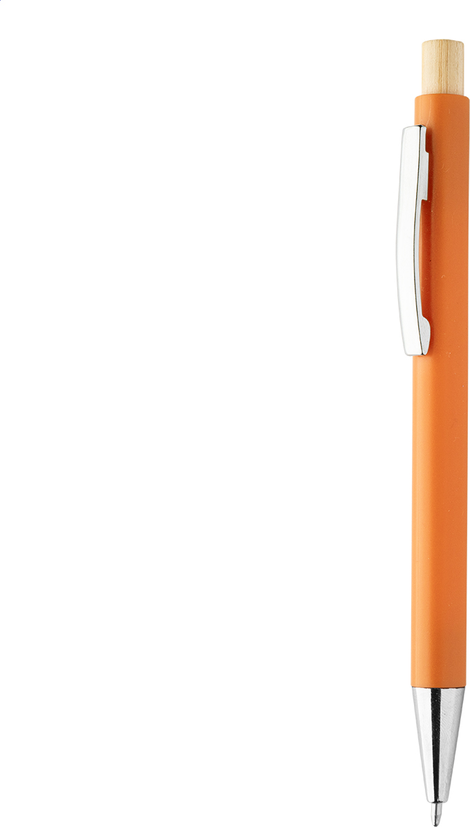 Kuličkové pero z recyklovaného ABS plastu s bambusovým tlačítkem a kovovým klipem. S modrou náplní.