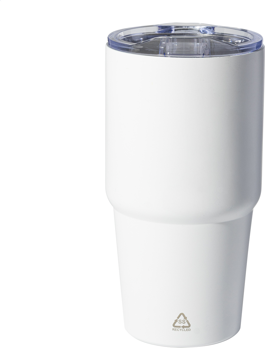 Dvoustěnný vakuově izolovaný termohrnek z recyklované nerezové oceli s víčkem z polystyrenového plastu. 600 ml.