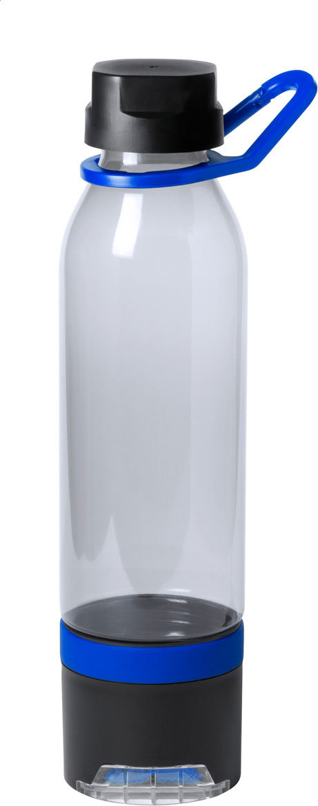 Plastová multifunkční sportovní láhev s chladicím ručníkem (390 g/m²) ve spodní přihrádce a výsuvným držákem na mobilní telefon. V dárkovém balení. Objem 650 ml. Není vhodná pro sycené nápoje.