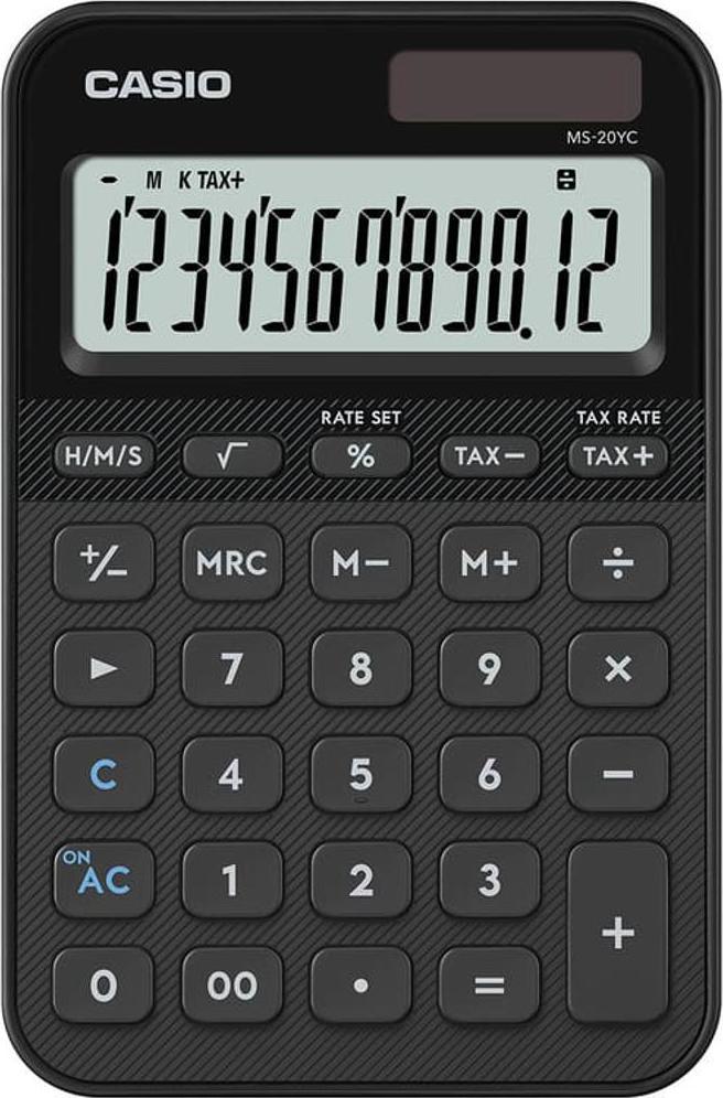 stolní kalkulačkaCasio MS 20 YC12-místný LCD displejvýpočet DPHprofesinální výpočet procentvýpočet marže s tlačítkem procentodmocninaopravné tlačítkovýpočty s časemzměna znaménka (+/-)vyrovnávací paměť3-tlačítková paměťzobrazení funkcí na displeji3-číslicový odělovačsolární/bateriové napájenízáložní baterieautomatické vypnutítlačítko dvojité nulyplastová tlačítkagumové nožičkyrozměry 101 x 154,5 x 18 mmhmotnost 118 g