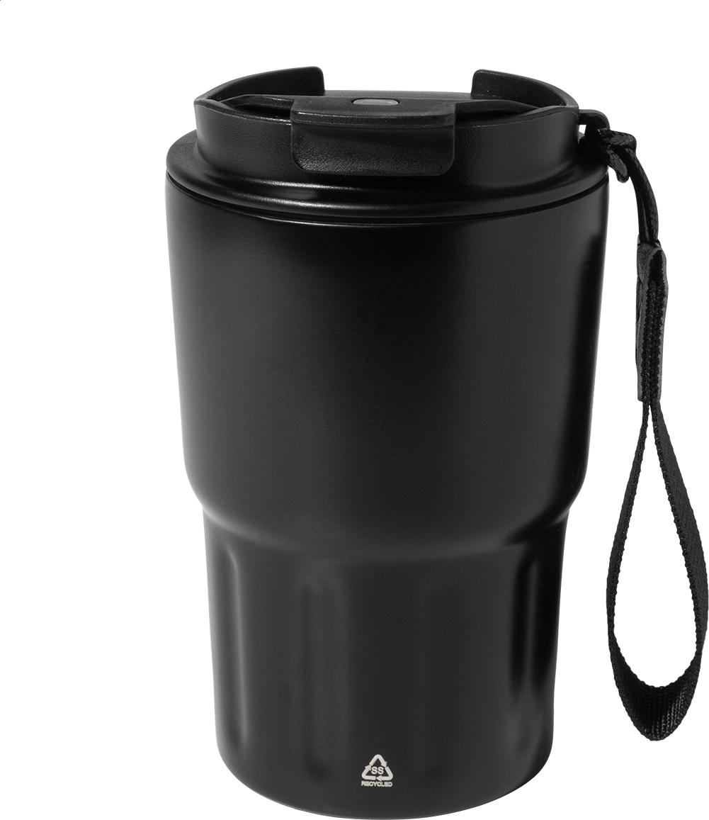Dvoustěnný termo hrnek z recyklované nerezové oceli s izolačním víčkem z PP. S poutkem z RPET polyesteru. 350 ml.