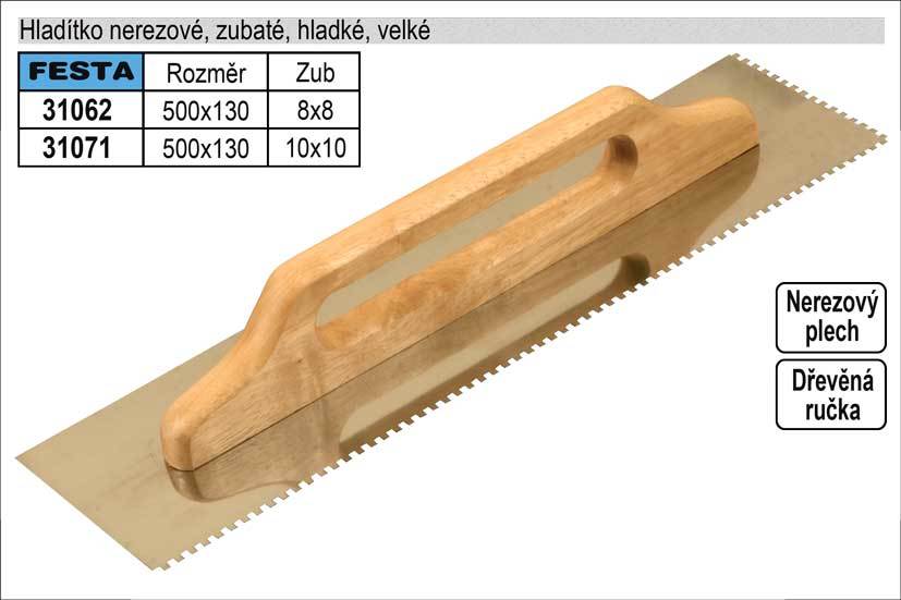 Hladítko nerezové zubové FESTA 500x130 mm, zub e8, s dřevěnou rukojetí, tl.plechu 0,7 mm. Používá se zejména k nanášení lepidel pod obklady a dlažby, dále pak k nanášení stěrek, štuků, omítek, tmelů a dalších stavebních hmot. Hladítko nerezové zubové umožní natáhnout lepidlo či stavební hmotu v pruzích a výšce dle zubu hladítka.