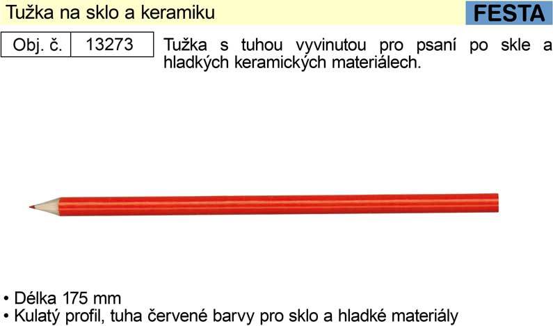 Tužka s tuhou vyvinutou pro psaní po skle a hladkých keramických materiálech.• Tužka na sklo a keramiku s červenou tuhou• Délka 175 mm• Tuha červené barvy pro sklo a hladké materiály
