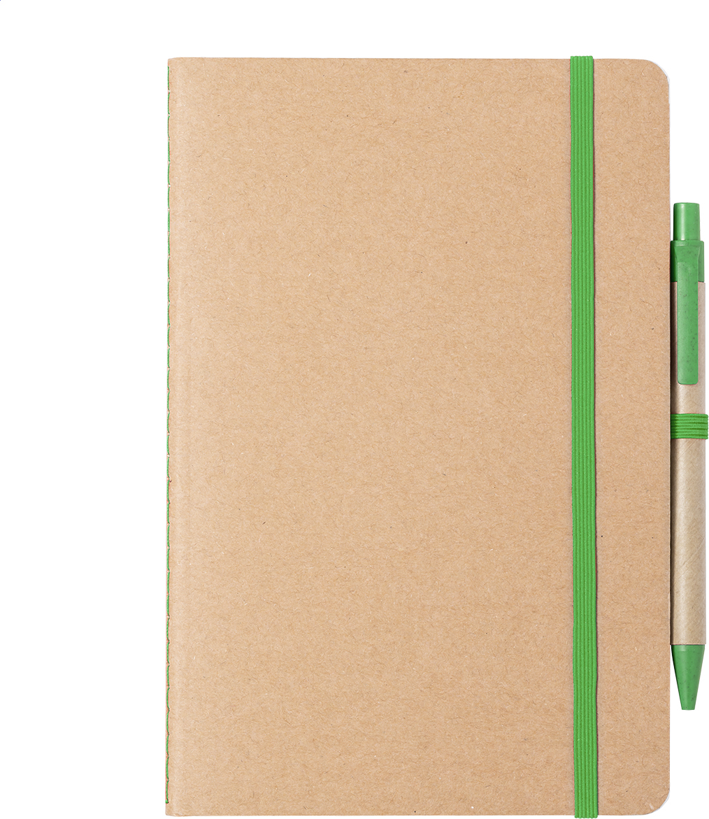 Blok A5 z recyklovaného kartonu s 60 čistými listy a barevnou gumičkou. Včetně plastového kuličkového pera z pšeničné slámy s modrou náplní.