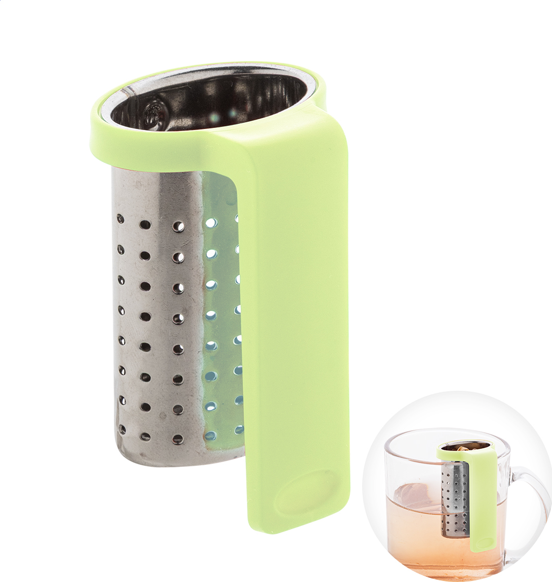 Nerezové sítko na čaj s praktickým klipem z recyklovaného ABS plastu. Navržen pro snadné připevnění k okraji hrnku.