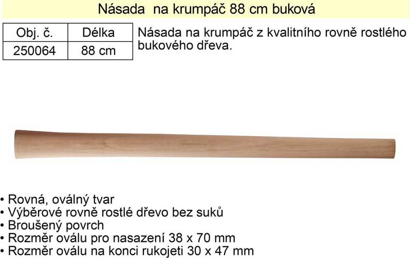 Násada na krumpáč z kvalitního rovně rostlého bukového dřeva.• Násada na krumpáč 88 cm buková• Délka 88 cm rovná, oválný tvar • Výběrové rovně rostlé dřevo bez suků• Broušený povrch• Rozměr oválu pro nasazení 38 x 70 mm• Rozměr oválu na konci rukojeti 30 x 47 mm
