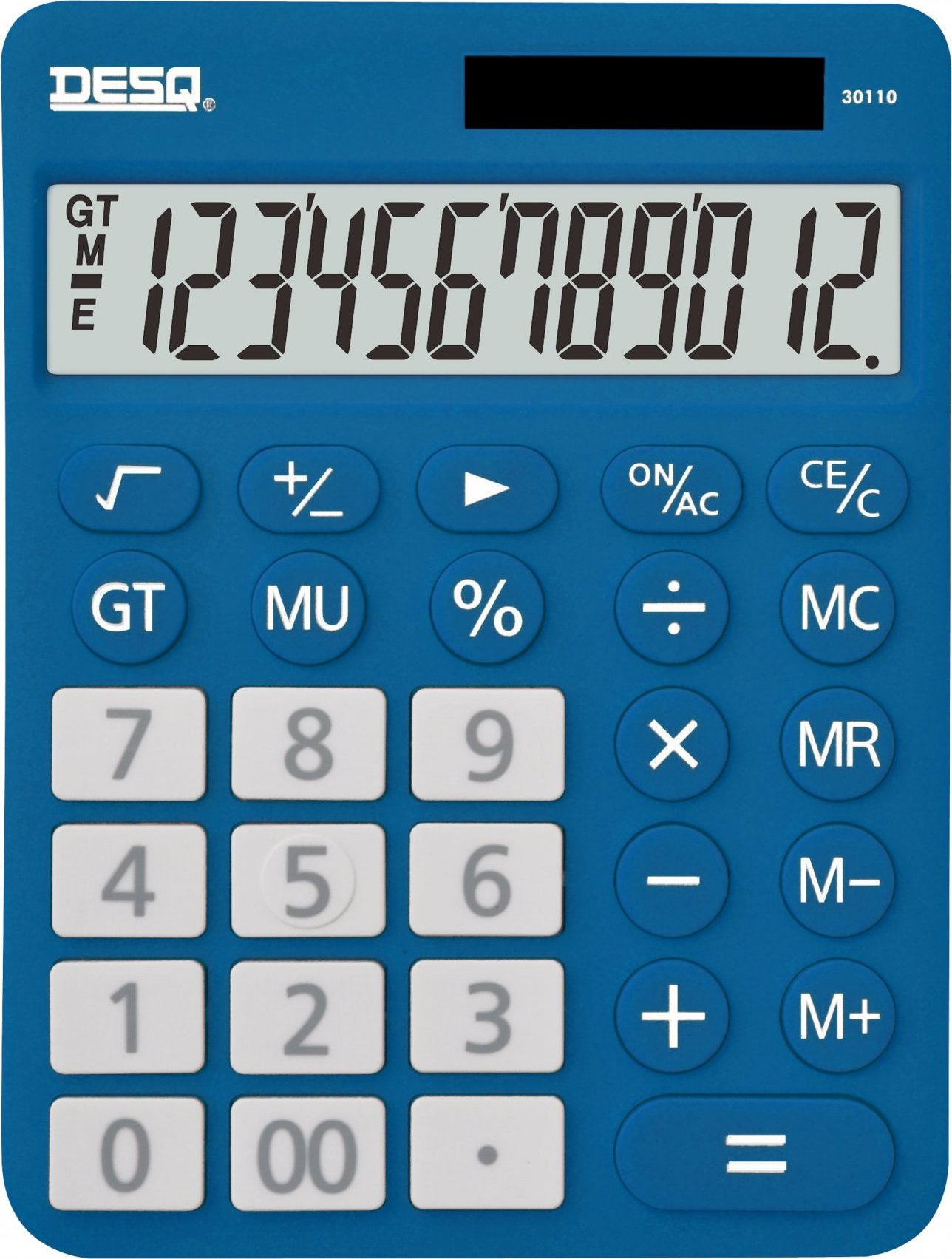 Velká stolní kalkulačka v tmavě modré barvě12ti místný LCD displejVelká tlačítkaFunkce MU, GT, Backspace, tlačítko s dvojitou nulou, tlačítko (+/-)Tlačítka pro výpočet procent a odmocninyTrojciferná interpunkce4 tlačítková paměťAutomatické vypnutí, které šetří energiiNapájení pomocí solárního panelu nebo baterie AAA (součástí balení)Hmotnost 200 gRozměr 185 x 140 x 30,5 mm