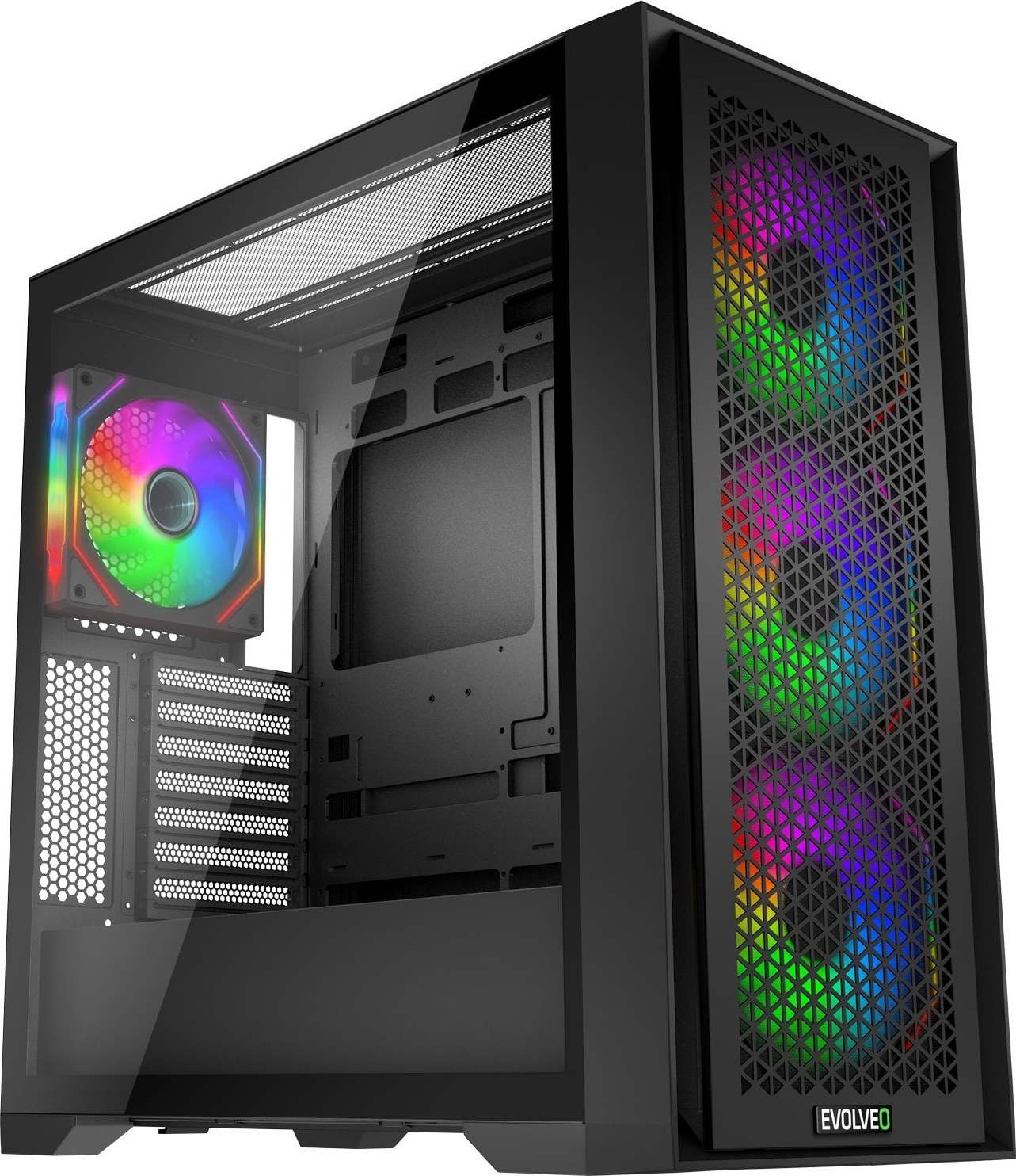 Podpora ATX, eATX, mATX, mITX4x ARGB ventilátor (120 mm)QuintFlow technologieCPU chladič max. výška 180 mmVGA karta max. délka 415 mm2x USB 3.2 Gen 1 / 1x USB-C /1x HD Audio / 1x mikrofonHerní počítačová (e)ATX skříň EVOLVEO Rhino-BK-4Co kdyby vaše počítačová skříň nebyla jen nudnou krabicí na hardware, ale opravdovým zlatým grálem vašeho herního koutku? Něčím, co ve vás při vstupu do místnosti vyvolá pocit hrdosti, jako když se díváte na nový vůz v garáži? EVOLVEO Rhino-BK-4 mění tento sen v realitu. Jde o velkorysou PC skříň typu Big Tower (rozměry 238 × 491 × 472 mm), která vašim herním ambicím poskytne nejen fyzický prostor, ale také vizuální styl a technickou vybavenost, kterou jako nároční hráči potřebujete.Skříň má robustní konstrukci s 0,7mm plechy a podporuje základní desky značek Intel i AMD celé řady formátů – ATX, eATX (Extended ATX), mATX (Micro ATX) i mITX (mini ITX). Jako ulitý jí padne napájecí zdroj klasického formátu ATX.Okno do vaší hardwarové síně slávyHned na první dobrou vás tato PC skříň osloví bočnicí ze čtyřmilimetrového tvrzeného skla, která dává hardwarové skvosty vašeho počítače hrdě na odiv. Nejde přitom o ledajakou průhlednou stěnu. Jejím základem je totiž bezpečnostní temperované sklo, které se při havárii místo ostrých střepů rozpadá na bezpečné drobné kousky. Když už tak nedejbože dojde na nejhorší, zas taková katastrofa to není.Díky skleněné bočnici máte navíc do vnitřních sfér své herní mašiny kdykoliv perfektní přístup. Stačí využít šikovný nacvakávací systém ClickFix a útroby počítače se vám vyjeví jako otevřená kniha.Dvojitý čelní panelČelní panel této PC skříně má dvojitou konstrukci. Dekorační část je jako dokonale padnoucí oblek, který dodává skříni eleganci, zatímco filtrační vrstva s ultrajemnou strukturou si bere na starost špinavou práci – stará se o to, aby bylo uvnitř počítače hezky čisto. EVOLVEO Rhino-BK-4 zkrátka myslí na vše. Ví, že šaty dělají člověka, ale taky si důsledně zametá před vlastním prahem.Demontáž i montáž čelního panelu zvládnete díky mechanismu ClickFix levou zadní. Když tak bude např. potřeba vyčistit filtr, dostanete se k němu velmi jednoduše.4 ventilátory s magickým zrcadlovým efektemTato PC skříň je sídlem nejen pro váš hardware, ale i pro čtveřici ventilátorů Infinity Mirror. Ty jsou strategicky rozmístěny a perfektně vyzbrojeny pro boj proti přehřívání počítače, ovšem jak je u EVOLVEO Rhino-BK-4 dobrým zvykem, dbají i na eleganci. Zdobí je Multi ARGB podsvícení s 22 LED diodami (8 uprostřed a 14 na vnějším obvodu každého ventilátoru), doplněné o působivý zrcadlový design. Díky soustavě zrcadel se světlo odráží a znásobuje, až se vám zdá, že v PC skříni svíti stovky žároviček. Jde o opravdu úchvatný efekt, který dává herní atmosféře tu pravou šťávu.Styl podsvícení ventilátorů můžete nechat na vaší základní desce nebo ho mít díky tlačítku v pravé horní části skříně ve vlastní režii. K dispozici máte 14 barevných režimů, od jednobarevného osvětlení přes decentní prolínání barev až po futuristické blikací módy.Tiché a spolehlivé chlazeníKaždý ventilátor disponuje hydrodynamickým ložiskem a provádí až 1200 otáček za minutu. Vzduch tak ve skříni cirkuluje bez přestávky (průtok vzduchu je až 32,45 CFM), přičemž maximální hlučnost je jen 24,5 dB. Ať už se tak bavíte virtuálním tenisem, nebo paříte válečnou střílečku, bez obav můžete hrát dlouho do noci, aniž byste rušili okolí. Nežádoucímu hluku navíc zabraňují i dvě čtveřice pěnových bumperů v rozích ventilátorů, jejichž zásluhou se do těla skříně nepřenáší vibrace.Průtok vzduchu podporuje i boční průduch na pravé straně skříně a odnímatelná perforovaná část horní strany. Ta je navíc doplněná o pevnou část se speciálně tvarovaným profilem pro lepší ochranu případného vodního chlazení.Pro ledově chladné komponentyPři hraní počítačových her je chlazení hardwaru klíčové. Právě proto je tady systém QuintFlow s 5 promyšleně zorganizovanými vzduchovými proudy (přes čelní, horní, spodní, zadní a boční průduchy). Vzduch tak postupně chladí všechny komponenty, které si to vyžadují. A výsledek? Hardware zůstává i při maximální zátěži ledově chladný, takže se můžete naplno věnovat hře.Prostor pro hardwarový dream teamV počítačové skříni EVOLVEO Rhino-BK-4 je dostatek místa na všechno, co má nadupaná herní mašina mít. Vejde se sem až 415mm grafická karta, chladič procesoru o výšce až 180 mm i všechny potřebné disky – ve skříni jsou 4 pozice pro 3,5" HDD a 5 slotů pro 2,5" SSD. Nic vám tak nebrání sestavit si počítač, jehož hardware hraje první ligu.O to, aby vnitřek skříně působil čistě a profesionálně, se navíc stará 32mm Cable Management pro skrytí kabeláže.Myslí i na budoucnostProtože jde vývoj techniky neustále kupředu, je tato PC skříň připravena i na případné upgrady. Ve spodní části je místo na dva další 120mm ventilátory a ještě dva nebo tři (120/140 mm) se vejdou do horní části. Také můžete sestavu doplnit o chladiče různých velikostí. A na další komponenty čeká i sedm rozšiřujících PCI slotů pro montáž a vyvedení portů z rozšiřujících karet vložených do základní desky. Bohatství své počítačové sestavy tak můžete i nadále rozšiřovat – EVOLVEO Rhino-BK-4 je zkrátka investicí na dlouhé roky.Velikost: Big TowerPodporovaný formát napájecího zdroje: ATXDvojitá konstrukce čelního panelu (dekorační část + filtrační část):Samostatný prachový filtr čelního paneluPrůhle