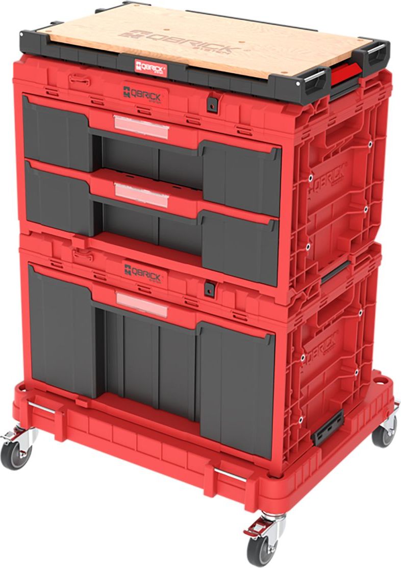 Organizer QBRICK® ONE – Workshop Drawers SET 7 Profesionální modulární set pro dílnu i montáže v terénu. Skládací systém QBRICK® ONE Workshop Drawers SET 7 spojuje organizaci nářadí, mobilitu a pracovní plochu do jednoho celku. Všechny moduly jsou vzájemně kompatibilní a pevně se propojují přes systémové zámky. Co je v setu Drawer 1 Toolbox 2.0 – box s 1× hlubokou zásuvkou (na vyšší nářadí a příslušenství). Nosnost boxu 18 kg, objem boxu 32.5 L, materiál boxu ABS Drawer 2 Toolbox 2.0 – box s 2× zásuvkami střední hloubky (pro drobné díly, bity, vrtáky, ruční nářadí). Nosnost jedné zásuvky je 12 kg Multi Work Platform (adaptér) – pracovní modul se systémovým spojovacím prvkem (pevná plocha pro drobné montáže a zároveň adaptér pro propojení modulů). Maximální nosnost na organizéru 30 kg Workshop Transport Platform 2.0 – mobilní základna s kolečky pro komfortní převoz celé sestavy. Nosnost 120 kg Hlavní výhody Modulární koncept ONE 2.0 – bezpečné a rychlé spojování/rozpojování jednotlivých boxů. Průhledná a přehledná organizace - výsuvné zásuvky pro rychlý přístup bez nutnosti rozkládat celý stoh. Mobilita bez námahy – masivní transportní platforma s otočnými kolečky pro plynulý přesun po dílně. Pracovní plocha vždy po ruce – Multi Work Platform slouží jako adaptér i jako užitečná mini-pracovna na místě zásahu. Odolné zpracování - robustní plastové tělo a pevné zámky navržené pro dílenské použití. Univerzální využití – pro elektrikáře, montéry, servis, auto-moto, hobby dílnu i řemeslníky v terénu. Celkové rozměry: 450x390x690 cm Kompatibilní s moduly QBRICK® ONE 2.0. Ilustrační příslušenství není součástí balení. Video: