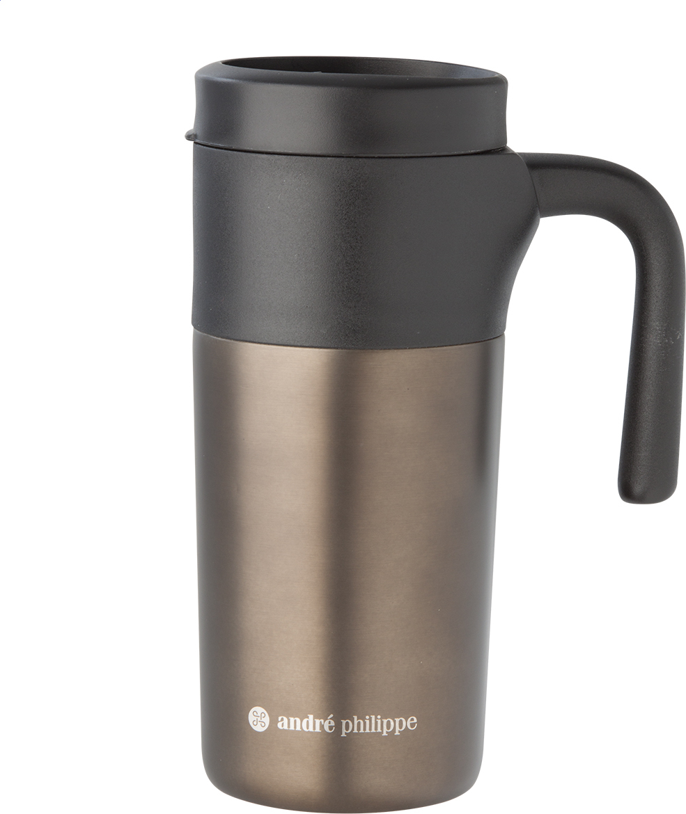 Nerezový jednostěnný termo hrnek s plastovým úchytem a víčkem 330 ml, v černé dárkové krabičce. Značkový produkt André Philippe.