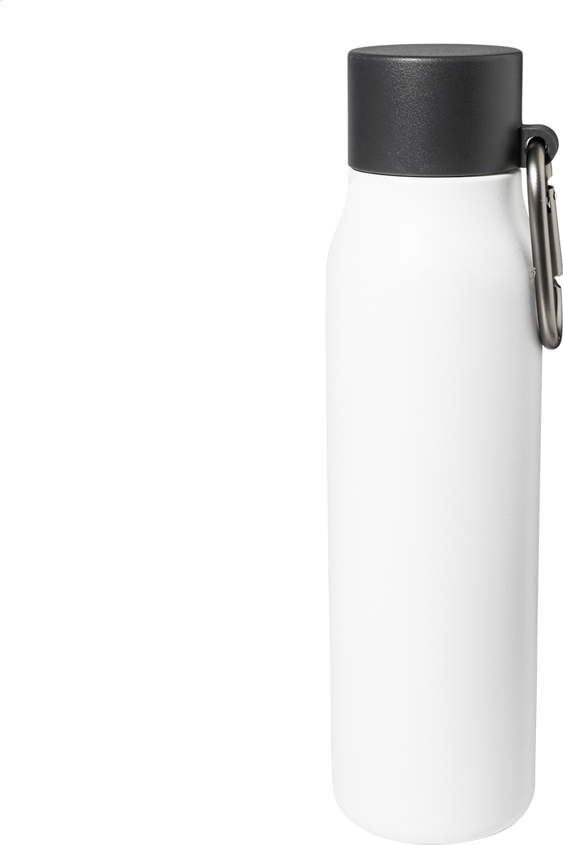 Dvoustěnná vakuová láhev z recyklované nerezové oceli s víčkem z PP a karabinou z recyklovaného hliníku. 500 ml.