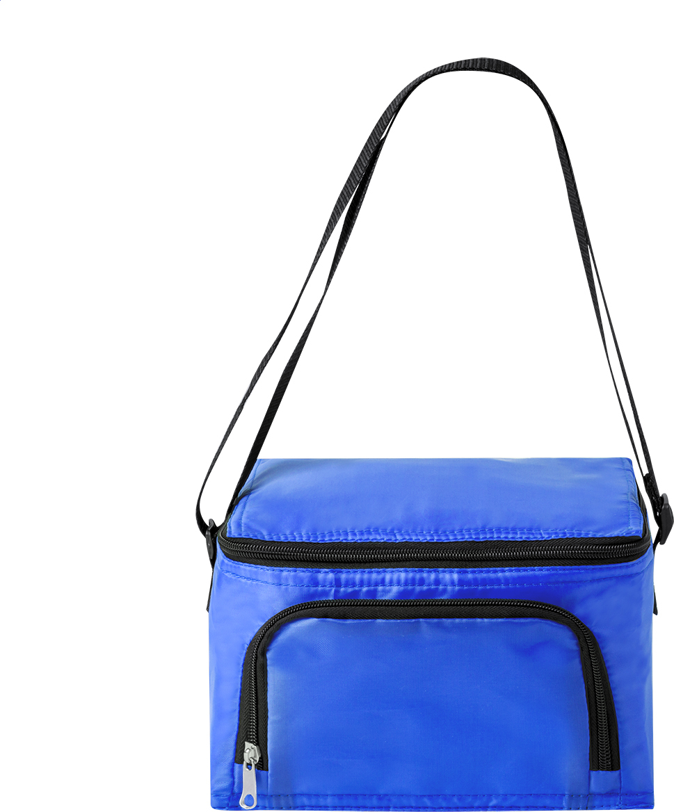 Polyesterová chladicí taška s přihrádkami na zip, hliníkovým polstrováním a ramenním popruhem. Pro 6 ks plechovek 0,33L. 210D polyester.