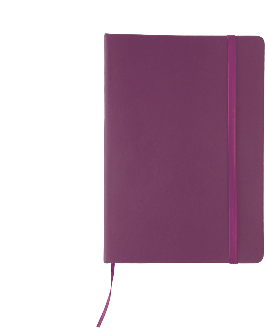 Poznámkový blok se 100 listy, záložkou a gumičkou.