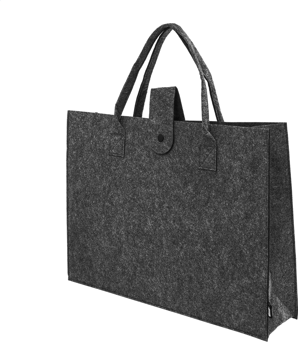 Nákupní taška z RPET plsti s klínkem, zapínáním na knoflíky a krátkými uchy. S výraznou etiketou z RPET.