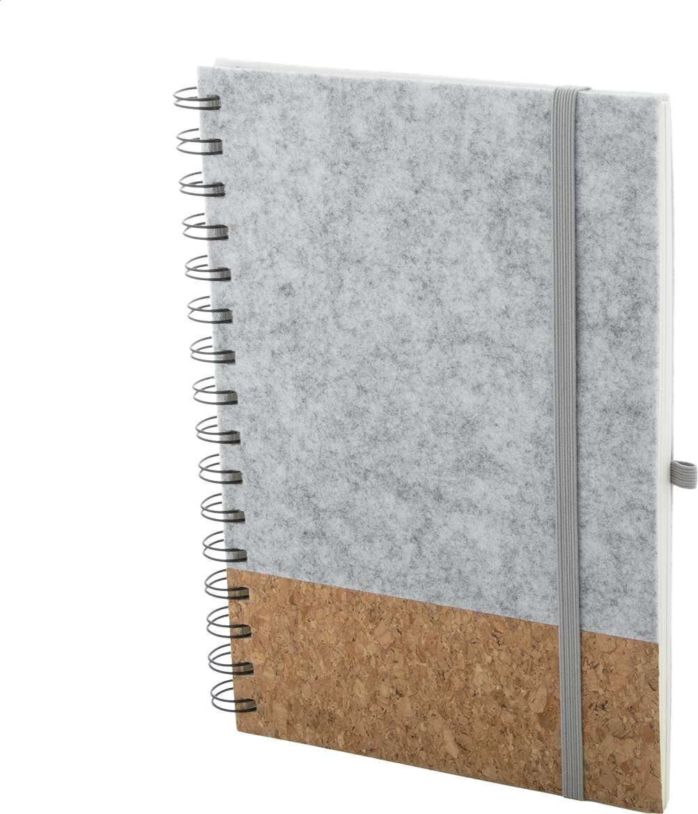 Spirálový blok A5 z RPET plsti a přírodního korku se 70 linkovanými listy z recyklovaného papíru. S gumovým páskem a držákem na pero.