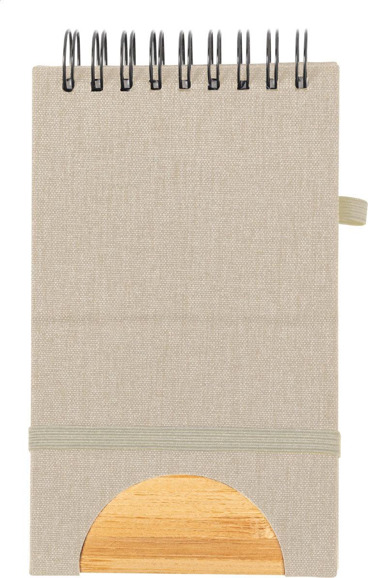 Spirálový blok potažený polyesterem RPET s bambusovou vložkou a funkcí držáku mobilního telefonu. S 80 prázdnými stránkami, gumičkou a držákem na pero.