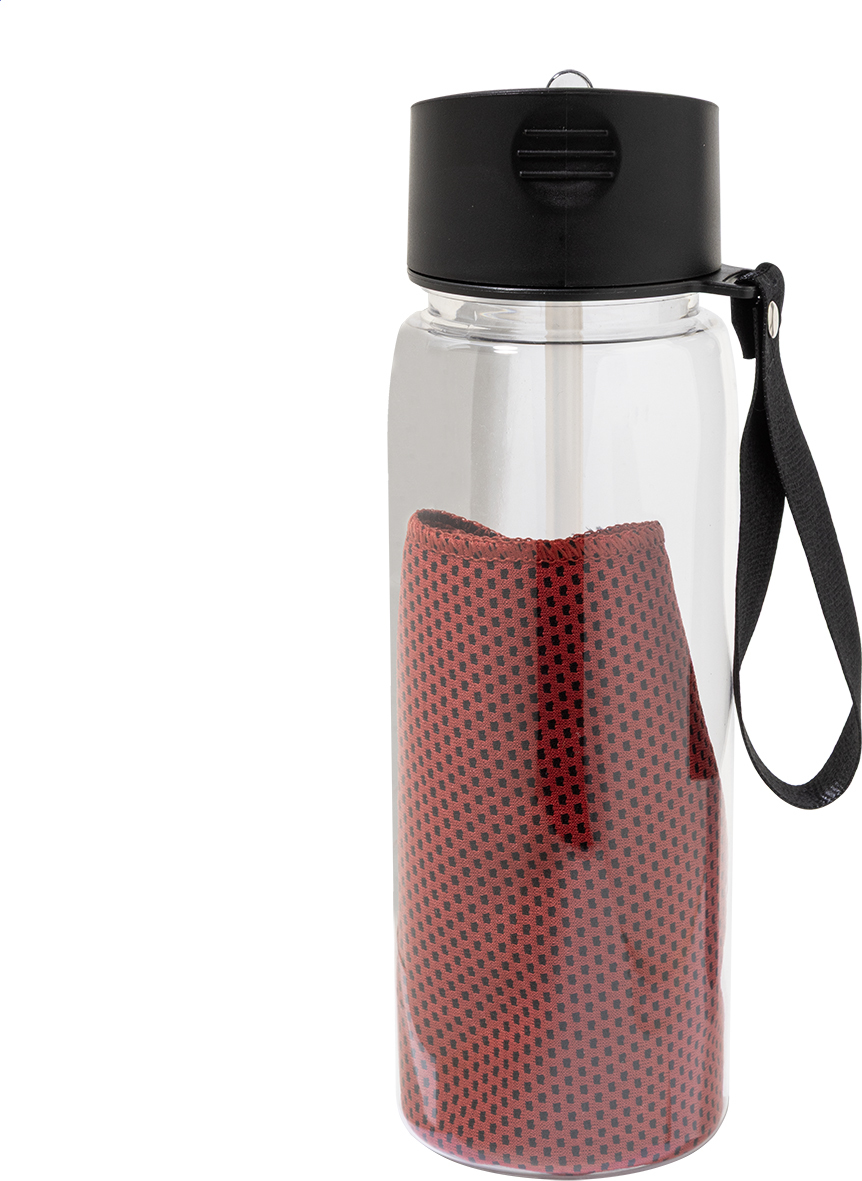 Chladicí sportovní ručník z RPET polyesteru v RPET sportovní lahvi s PP víčkem typu flip-top, integrovaným brčkem a přenosným popruhem. Objem 800 ml. Neobsahuje BPA. Není vhodná pro sycené nápoje. Velikost ručníku: 30 × 80 cm.
