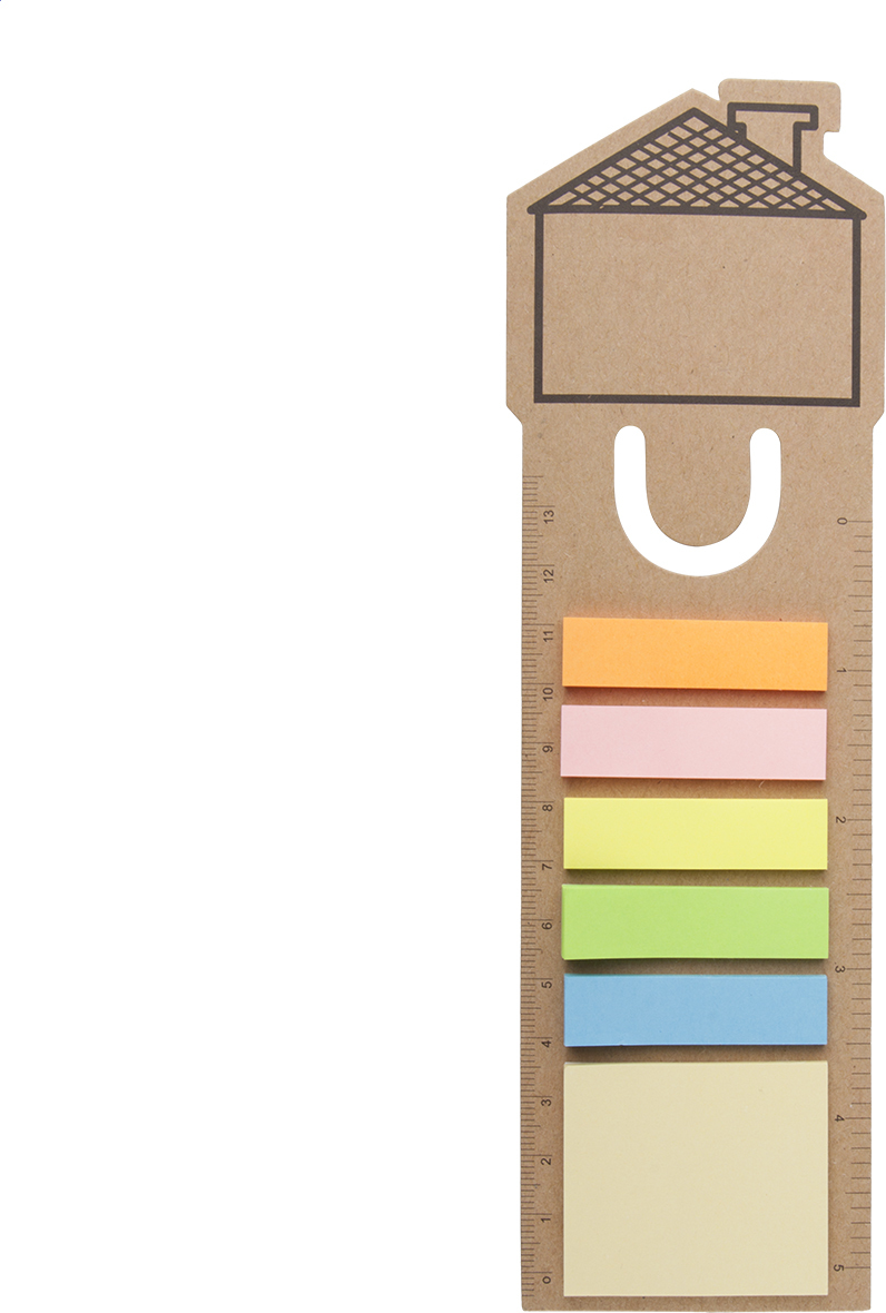 Papírová záložka do knihy a pravítko se samolepícími lístky s domečkem na konci.