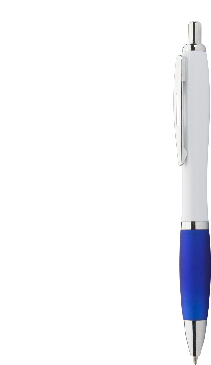 Kuličkové pero z recyklovaného ABS plastu s bílým tělem, barevným úchopem a chromovanými částmi. S modrou náplní.