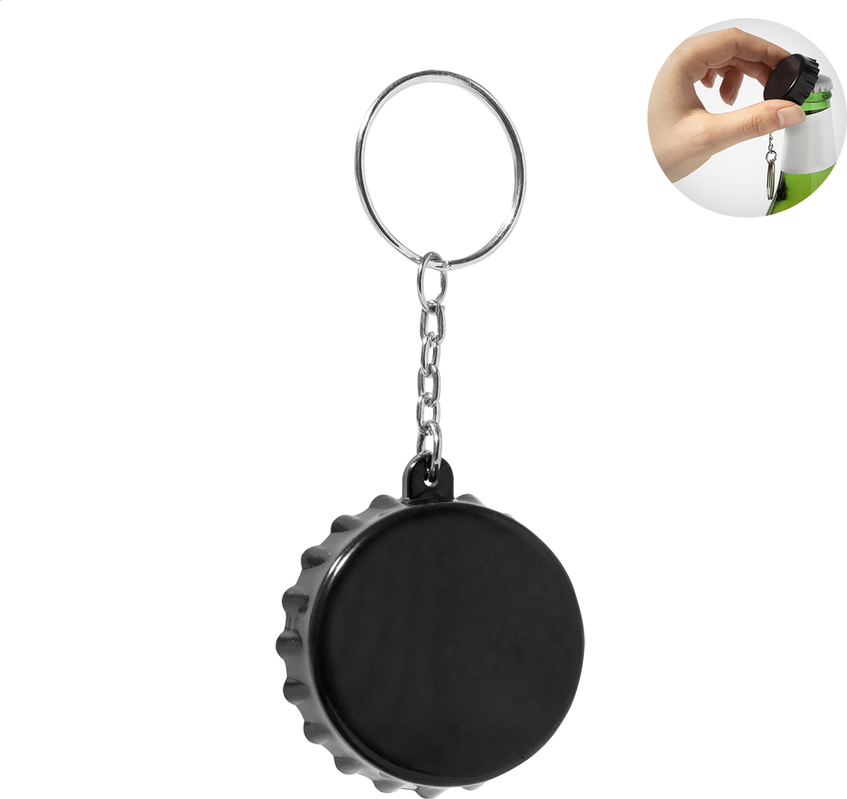 Přívěsek na klíče ve tvaru víčka z recyklovaného ABS plastu s otvírákem.