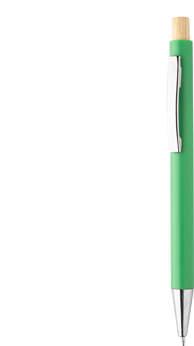 Kuličkové pero z recyklovaného ABS plastu s bambusovým tlačítkem a kovovým klipem. S modrou náplní.