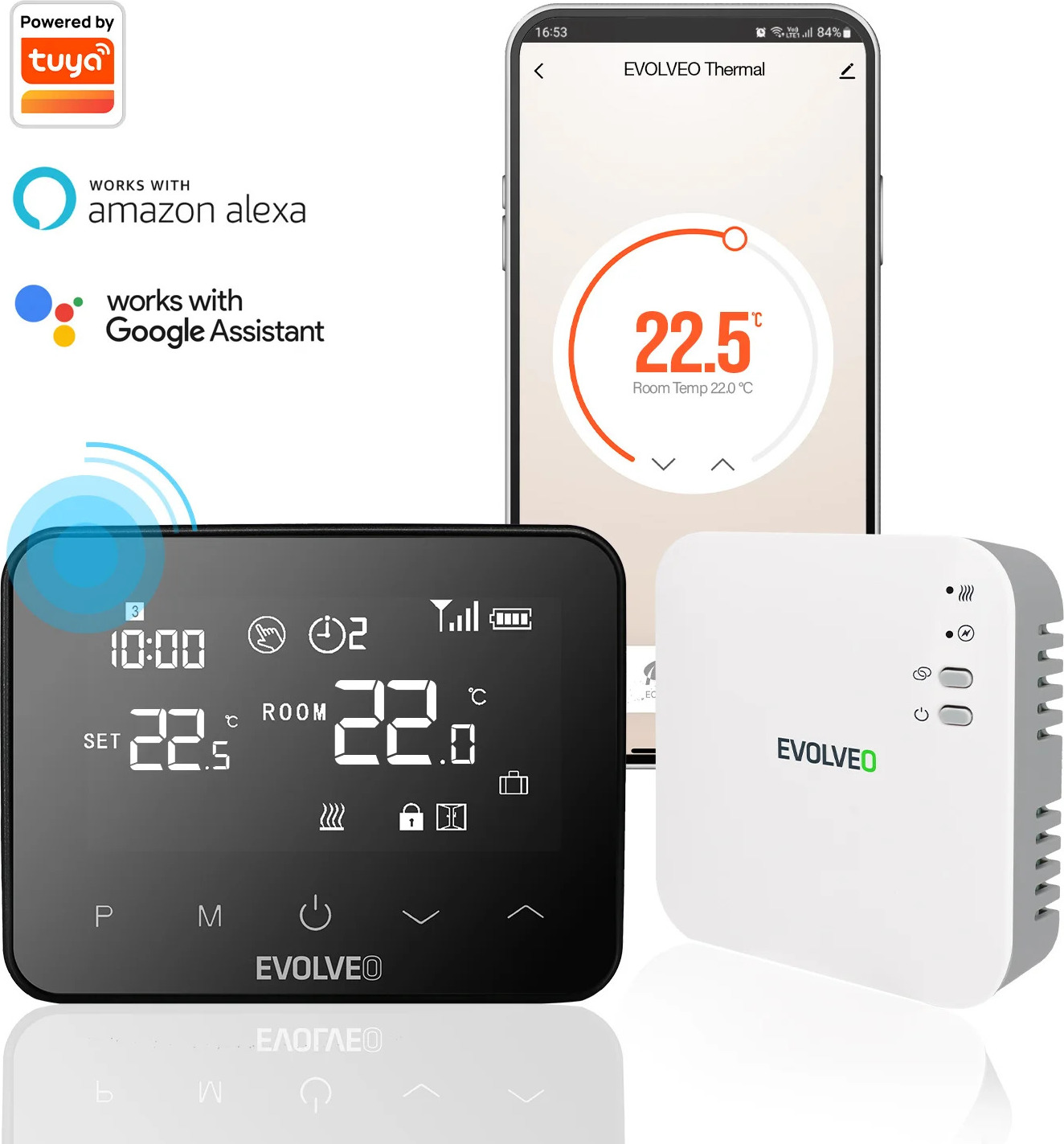 EVOLVEO Thermal, chytrý bezdrátový programovatelný termostat• Propojení s aplikacemi Tuya, Smart Life, SmartThings a IFTTT• Rozsáhlé možnosti nastavení aplikace• Programovatelný na každý den v týdnu se 4 časovými okny• Funkce detekce otevřeného okna a dětský zámek• Dotykový displej se zrcadlovým efektem• Podpora hlasových asistentů Google Assistant a Amazon Alexa• Flexibilní napájení pomocí napájecího adaptéru nebo 2 tužkových baterií ________________________________________________________________________________________________________________ Moderní řídicí systém pro optimální pohodlíChytrý bezdrátový termostat Thermal přináší moderní a inteligentní řešení pro efektivní řízení teploty v domácnosti. Jeho pokročilé funkce a snadné ovládání umožní dosáhnout optimálního pohodlí a úspory energie bez složité instalace. Termostat Thermal je navržen tak, aby splňoval různorodé potřeby v oblasti vytápění. Díky svému programovatelnému rozhraní a podpoře různých typů topných systémů je ideální volbou pro kotle nebo podlahové vytápění. Pohodlné ovládání pomocí chytré aplikaceTermostat je plně kompatibilní s aplikacemi Smart Life, Tuya, které jsou volně ke stažení pro systémy Android a iOS. Aplikace umožňují ovládat teplotu v domácnosti odkudkoliv pomocí chytrého telefonu nebo tabletu. Aplikace nabízí širokou škálu funkcí pro plnou kontrolu nad termostatem, včetně možnosti nastavení cílové a kontroly aktuální teploty, programování časových oken, nastavení teplotní meze ochrany proti, nastavení dětského zámku pro ochranu proti nechtěné změně nastavení teploty, nastavení funkce otevřeného okna, kalibrace teplotního senzoru pro přesné měření teploty, nastavení hystereze pro optimalizaci chodu vytápění, nastavení jasu podsvícení displeje podle preferencí uživatele a reset do továrního nastavení v případě potřeby. Intuitivní dotykový displej s podsvícenímS elegantním dotykovým displejem s podsvícením a zrcadlovým efektem nabízí termostat Thermal nejen vynikající vzhled, ale také jednoduché ovládání. Dotykové senzory umožňují snadné nastavení teploty a funkcí přímo na displeji. Široká škála funkcí pro maximální komfort a úsporu energieTermostat Thermal nabízí řadu pokročilých funkcí, jako je ochrana proti mrazu, dětský zámek a detekce otevřeného okna. Díky těmto funkcím se termostat aktivně přizpůsobuje okolním podmínkám a chování uživatele. Ochrana proti mrazu zajistí udržení optimální teploty v mrazivých podmínkách, dětský zámek zabrání nechtěné změně nastavení teploty, a detekce otevřeného okna zajišťuje, že termostat automaticky reaguje na větrání místnosti, což přispívá k úspoře energie. Flexibilní programování a plná kontrolaDíky možnosti programování na 7 dnů v týdnu a 4 časovým oknům pro každý den získáte plnou kontrolu nad teplotou v domácnosti. Termostat Thermal vám umožňuje nastavit různé teplotní profily pro různé časy dne. Termostat Thermal poskytuje flexibilitu ve způsobu napájení – můžete ho napájet buď bateriemi, nebo pomocí kabelu USB-C. Dále nabízí široký provozní dosah ve volném prostoru až 100 metrů a v uzavřeném prostoru až 25 metrů, což zajišťuje spolehlivý signál a kontrolu teploty i v rozlehlých interiérech. Snadná instalace a kompatibilitaTermostat Thermal je navržen tak, aby byl snadno instalovatelný a kompatibilní s různými topnými systémy. S dodanými montážními součástkami a návodem k instalaci lze termostat snadno namontovat na stěnu nebo umístit na stůl podle potřeb. Jeho kompatibilita s hlasovými asistenty Google Assistant, Amazon Alexa umožní ovládat teplotu v domácnosti hlasovými příkazy.SPECIFIKACE:• Vhodný pro připojení ke kotli, podlahovému vytápění• Skládá se ze dvou částí:1) Přijímač vyhodnocující teplotu v místnosti a komunikující skotlem/podlahovým vytápěním2) Vysílač umožňující ovládání a zobrazující aktuální stav• Možnost WiFi nebo Bluetooth propojení do aplikací Tuya, Smart Life, Samsung SmartThings nebo IFTTT pro telefony iPhone i Android• Dotykový digitální displej s inverzním podsvícením a zrcadlovým efektem• Možnost nastavení intenzity jasu podsvícení displeje při napájení z USB• Intenzita podsvícení při napájení z baterií: 40%• Teplotní senzor umístěný na vnějším povrchu vysílače pro vyšší přesnost• Programování na 7 dnů v týdnu (možnost programování pro dni)• 4 časová okna pro každý den v týdnu• Podpora hlasových asistentů Google Assistant a Amazon Alexa• Dětský zámek pro deaktivaci ovládání displeje• Detekce otevřeného okna:1) automatické vypnutí vytápění při náhlém poklesu teploty2) možnost nastavení meze poklesu teploty na 2-4 °C3) možnost nastavení časového úseku poklesu na 2-30 min.4) možnost nastavení návratu z režimu za 10-60 minut• Ochrana proti mrazu (automatické zahájení vytápění při poklesu pod nastavenou teplotní mez v rozsahu 5-15 °C)• Aplikace umožňuje:1) Nastavení cílové a kontrolu aktuální teploty2) Programování časových oken3) Nastavení teplotní meze ochrany proti mrazu s možností deaktivace funkce4) Nastavení dětského zámku s možností deaktivace funkce5) Nastavení funkce otevřeného okna vč. nastavení meze poklesu teploty, časového úseku poklesu a návratu z režimu s možností deaktivace funkce6) Kalibraci teplotního senzoru v rozsahu -8 až +8 °C7) Nastavení hystereze v rozsahu 0-3 °C8) Nastavení jasu podsvícení v rozsahu 0-100 %9) Reset do továrního nastavení• Režimy termostatu:1) Plně automatický programovatelný režim2) Manuální režim pro dočasné nastavení na konstantní teplot