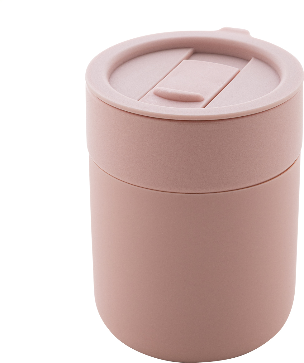 Keramický cestovní kelímek potažený silikonem s víčkem na pití z plastu PP. Objem 300 ml.
