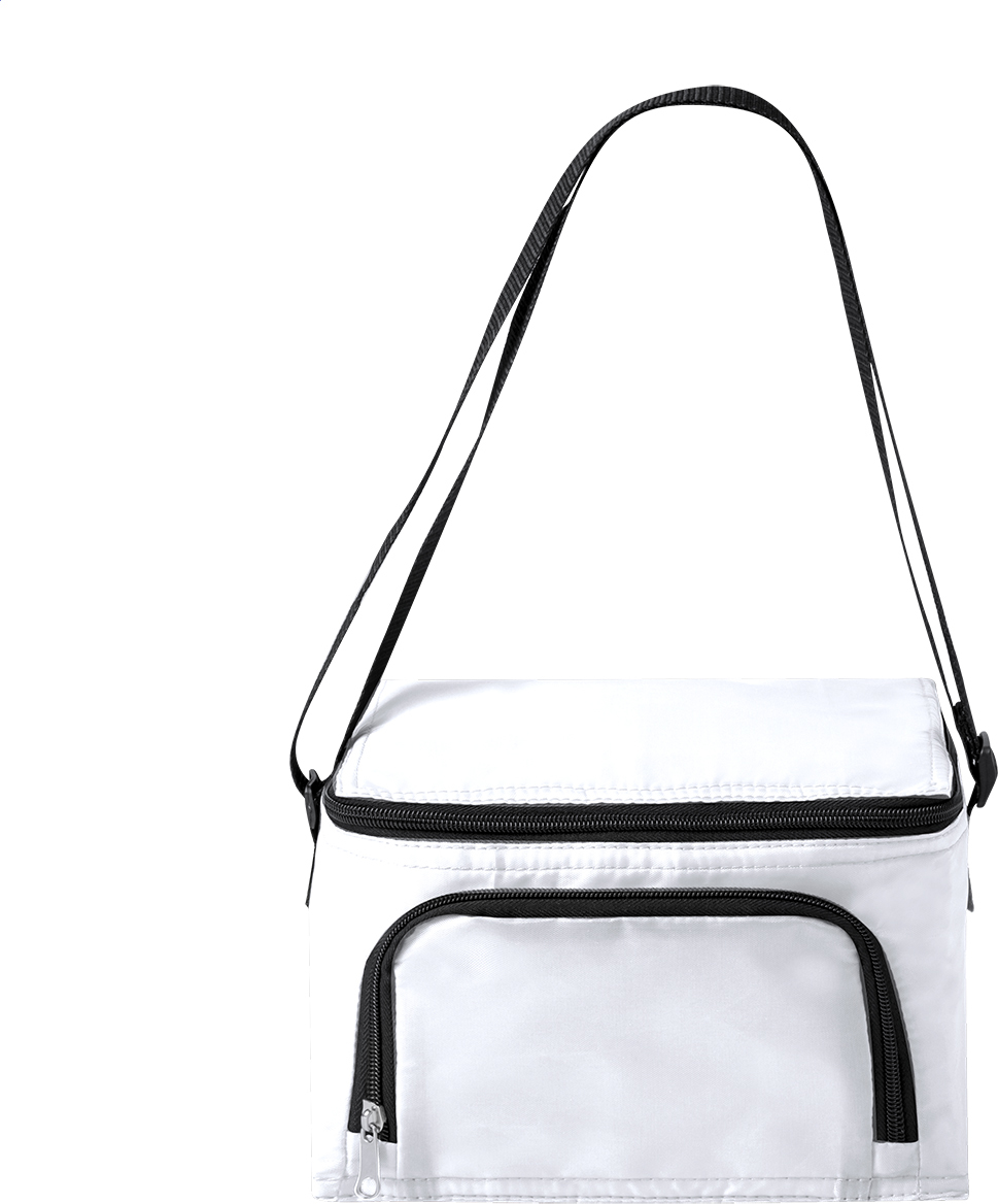 Polyesterová chladicí taška s přihrádkami na zip, hliníkovým polstrováním a ramenním popruhem. Pro 6 ks plechovek 0,33L. 210D polyester.
