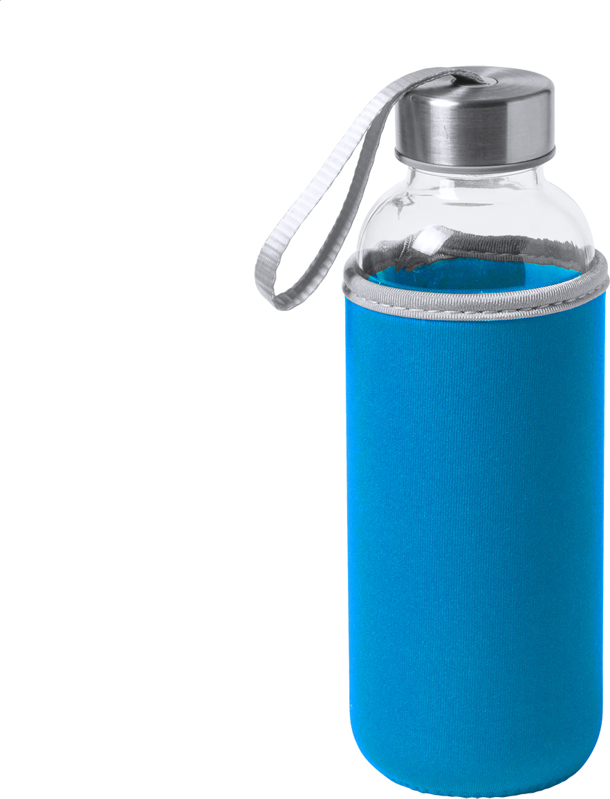 Skleněná láhev s popruhem na uzávěru a barevným neoprenovým krytem. 420 ml. Nevhodné pro sycené nápoje.