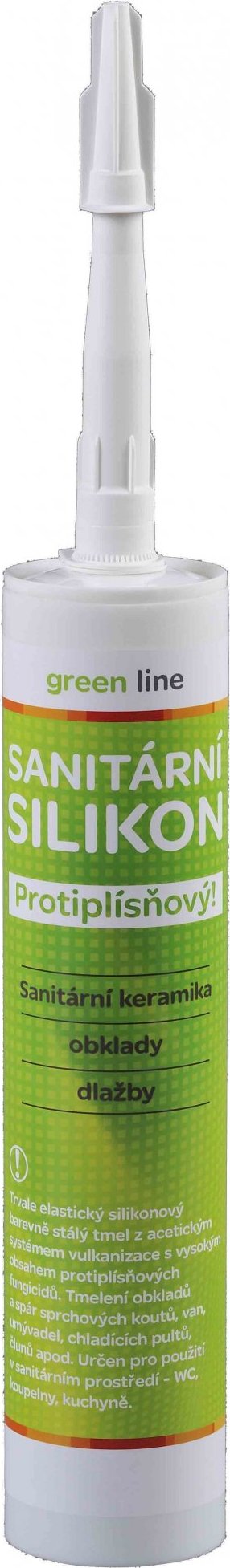 Sanitární silikon 280 ml, bílý, GREEN LINE. Pro spárování obkladů, veškeré sanitární keramiky (umyvadel, bidetů, pisoárů, WC mís), sprch, kuchyňských linek, smaltovaných koupelnových van apod. Vysoká přilnavost na sklo, smalt, dlaždice a glazurovanou keramiku. Výborná odolnost v sanitárním prostředí. objem: 280 ml barva: bílá